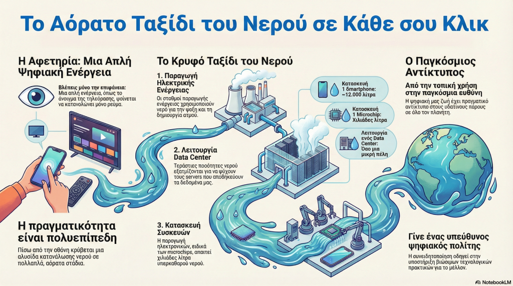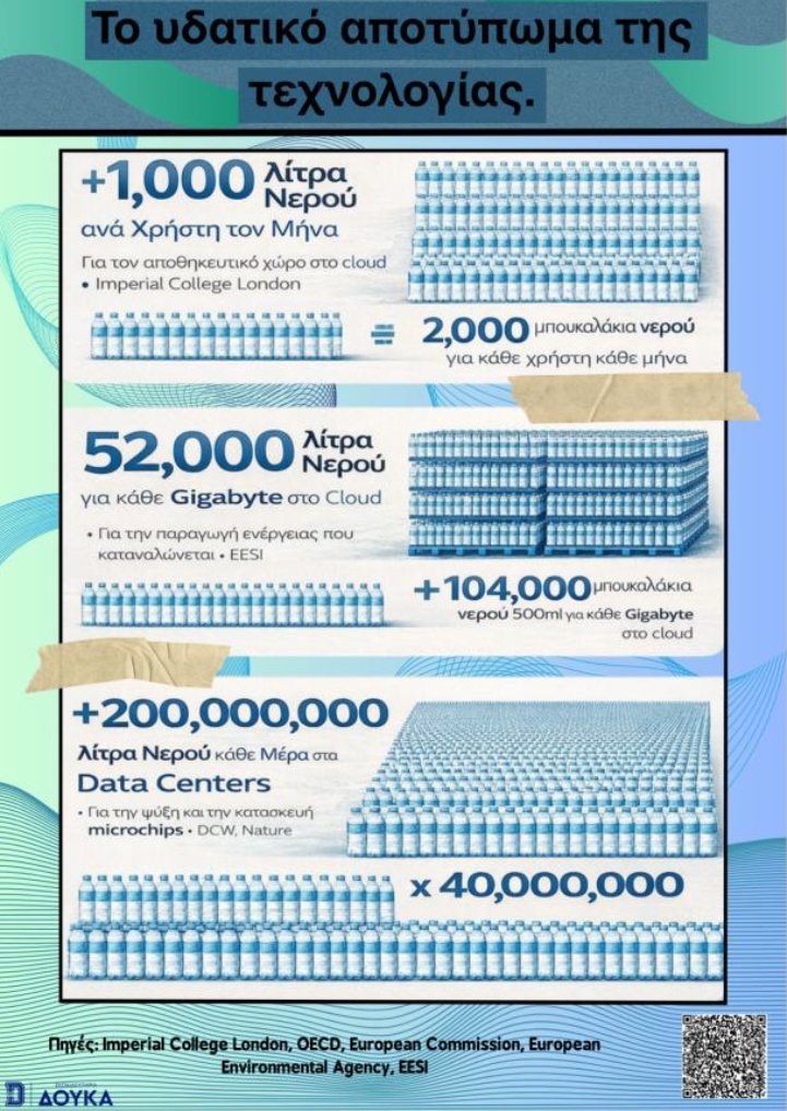 Υπό την καθοδήγηση και τον συντονισμό της καθηγήτριας Χημείας του Λυκείου μας, κας Γ. Δανιήλ, και του δρ. Ι. Κωτσάνη, Μηχανικού Η/Υ, αποφασίσαμε να ασχοληθούμε με ένα ζήτημα που συχνά δε γίνεται άμεσα αντιληπτό στους μαθητές: τη σπατάλη νερού που συνδέεται με τη σύγχρονη τεχνολογία και το ΑΙ, όπως τα data centres, οι ψηφιακές υπηρεσίες και οι υποδομές που στηρίζουν την καθημερινή μας ψηφιακή ζωή.