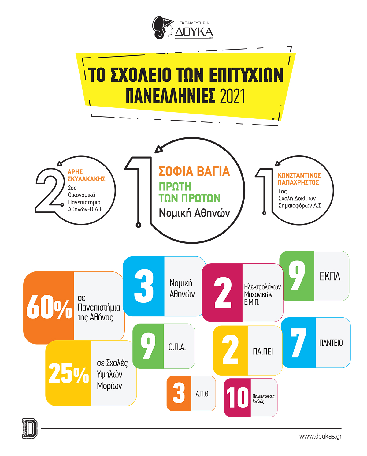 Τα κορυφαία Εκπαιδευτικά Ιδρύματα της χώρας θα υποδεχθούν σε λίγες μέρες τους Απόφοιτους των Εκπαιδευτηρίων Δούκα. Ενδεικτικά, η Νομική Αθηνών, το Εθνικό Μετσόβιο Πολυτεχνείο, το Εθνικό Καποδιστριακό Πανεπιστήμιο Αθηνών, το Πάντειο Πανεπιστήμιο, το Πανεπιστήμιο Πειραιά, το Αριστοτέλειο Πανεπιστήμιο Θεσσαλονίκης κ.α. Από τους μαθητές που συμμετείχαν στις Πανελλαδικές το 60% εισήχθη σε πανεπιστήμια της Αθήνας με το 25% να εισάγεται σε σχολές υψηλών μορίων.