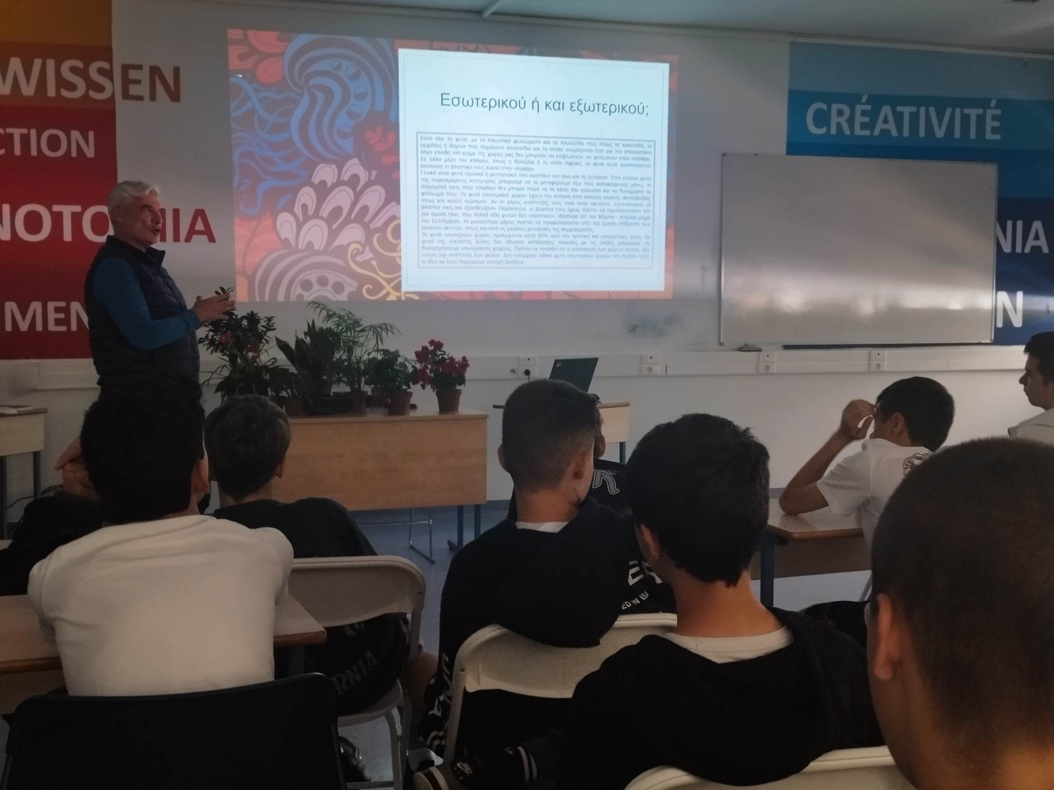 Στο πλαίσιο του ευρωπαϊκού έργου TEASPILS πραγματοποιήθηκε ομιλία την Παρασκευή στις 28 Απριλίου 2023 από τον γεωπόνο κ. Νικόλαο Κόκκινο απόφοιτο του Γεωπονικού Πανεπιστημίου Αθηνών και σύμβουλο επιχειρήσεων. Παρευρισκόμενοι ήταν μαθητές των γαλλικών τμημάτων της Β’ Γυμνασίου που συμμετέχουν στο πρόγραμμα, διάφοροι συνεργάτες και οι υπεύθυνοι του τμήματος ξένων γλωσσών.