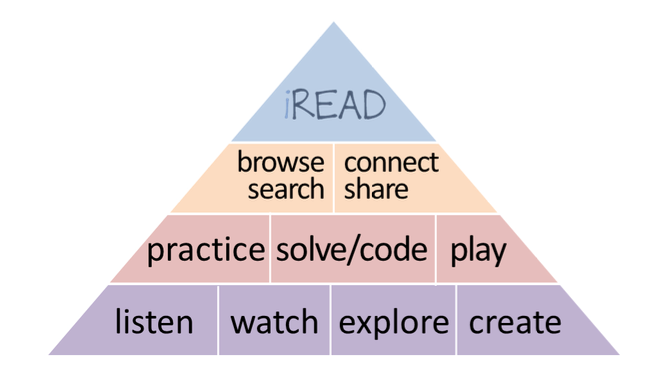 Η οργάνωση του υλικού στο πρότυπο tablet βασίστηκε στο “OpenSesame” model, όπως παρουσιάζεται στα (“Models of Competences” (Kotsanis 2018, ή σε μία παλιότερη ελληνική εκδοχή του). Για τον λόγο αυτό δημιουργήσαμε την “iRead Πυραμίδα” με 10 κύρια ρήματα δράσης(κατηγορίες) τα οποία σχετίζονται με αντίστοιχες ομάδες εφαρμογών.